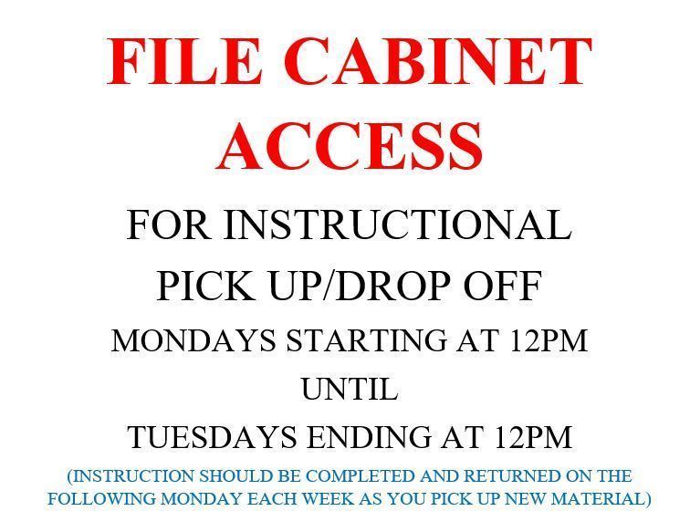 3. At your convenience by file cabinet, located at the high school and elementary front steps. (middle school cabinet located at the elementary) Mon. at 12pm-Tues, 12pm (24 hour window)
