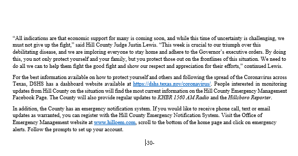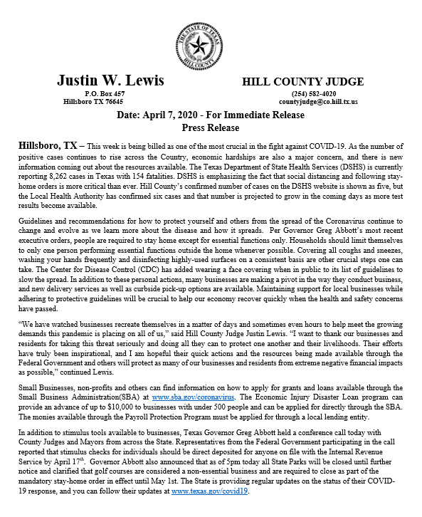 HILL COUNTY UPDATE 4.7.20