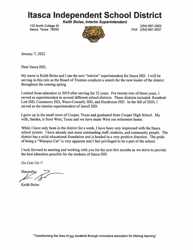 Interim Superintendent Keith Boles Introduction Letter