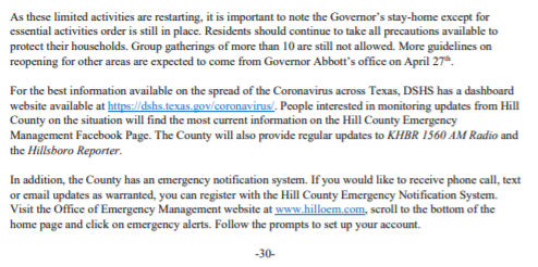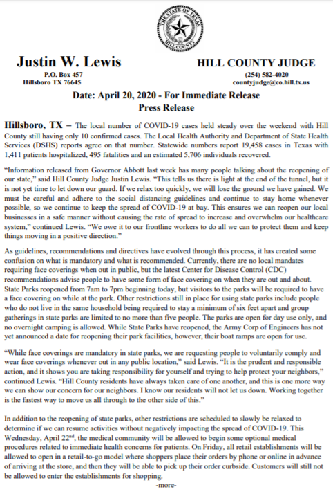 HILL COUNTY UPDATE 4.20.20